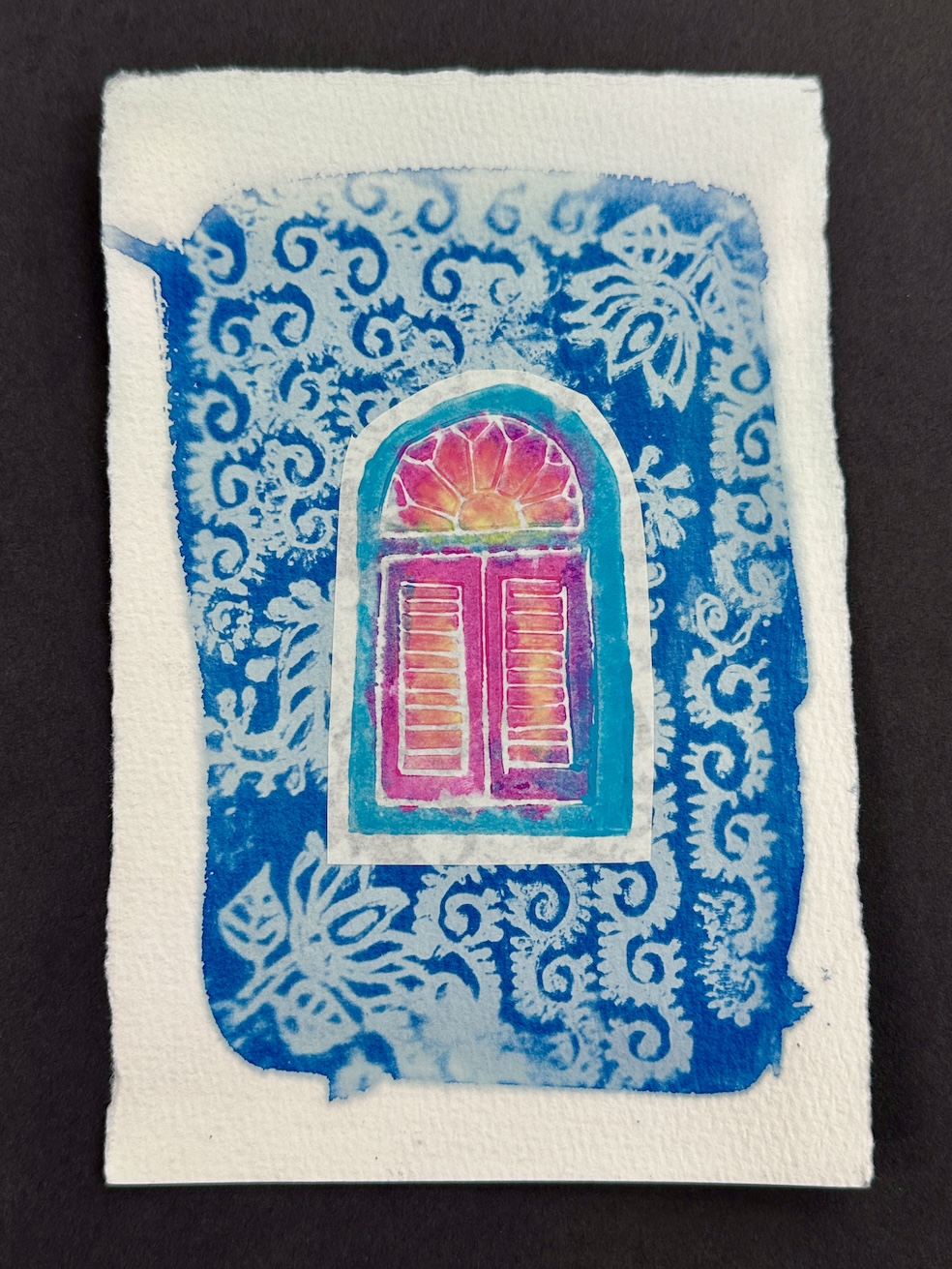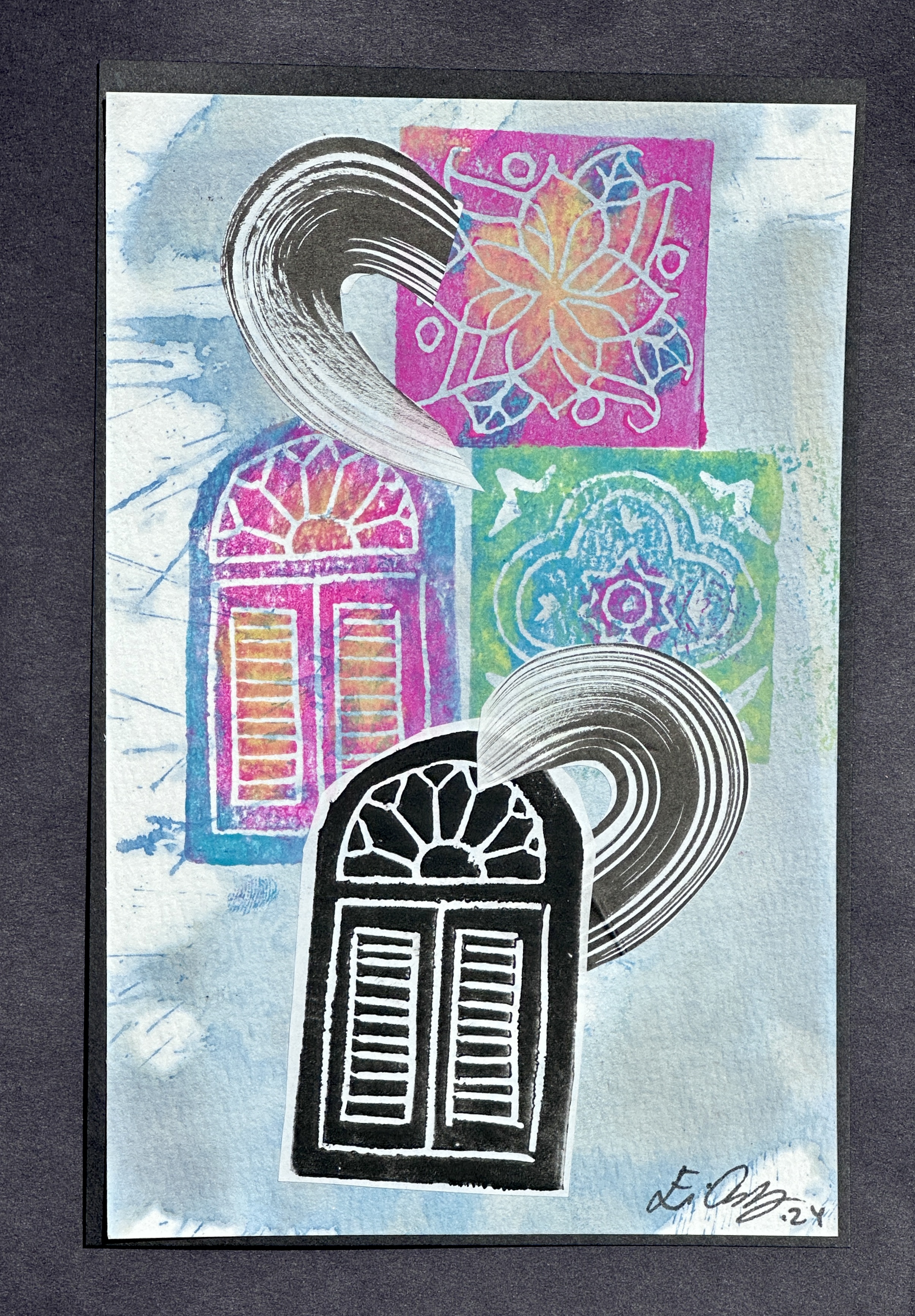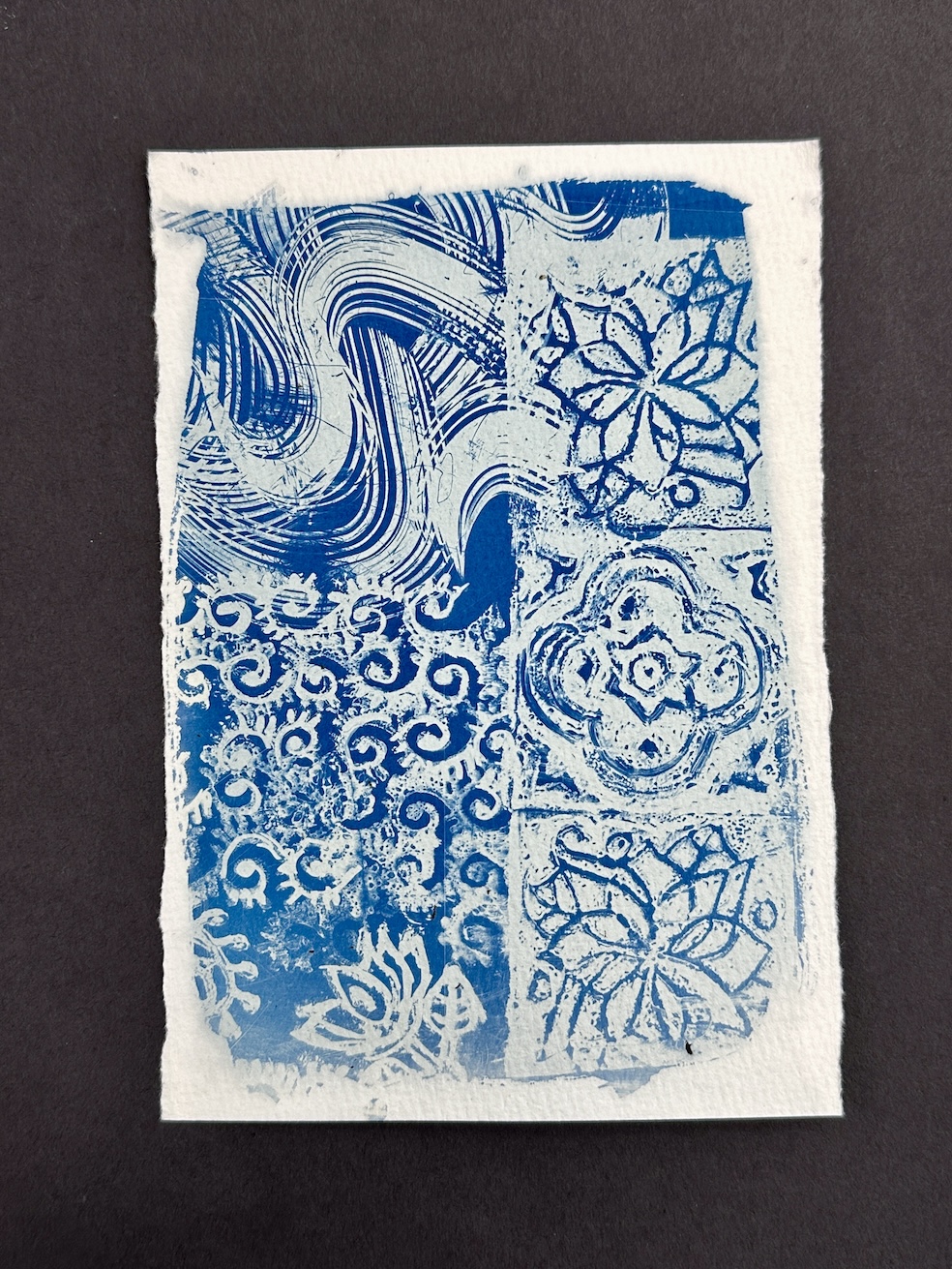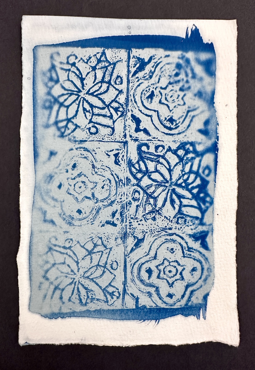 Drawing inspiration from her multicultural experiences, Erin layers patterns from Singapore and New Orleans represents, represetning her family. “Mixing materials like cyanotype, ink, and printing is a joyful passion of exploration for me.”