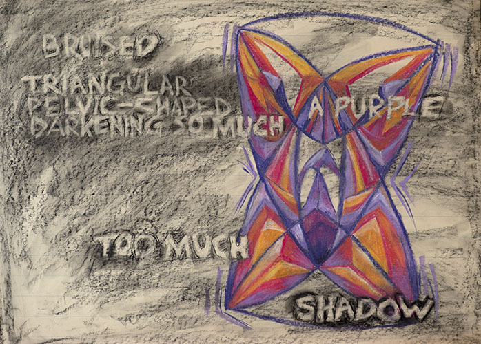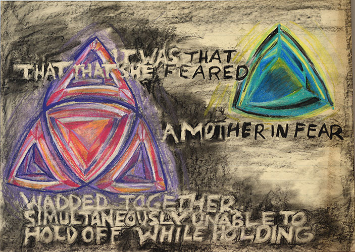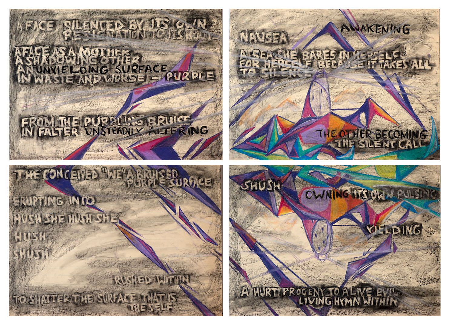 The medium—chalk pastel and charcoal on lined paper—evokes the residue left between relationships. The lined paper and faint traces of text ground the work in literary influence. Erased and partially visible, the text symbolizes how people, including Woolf’s characters, obscure parts of themselves to connect with others.